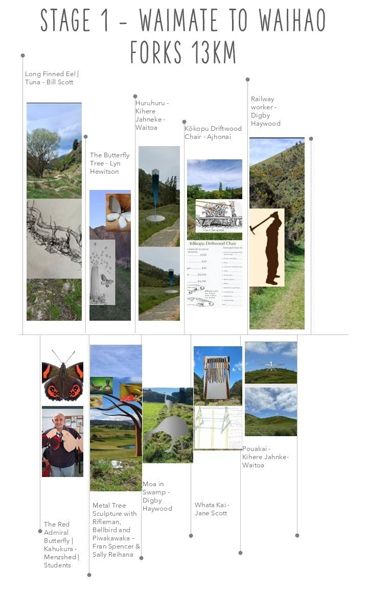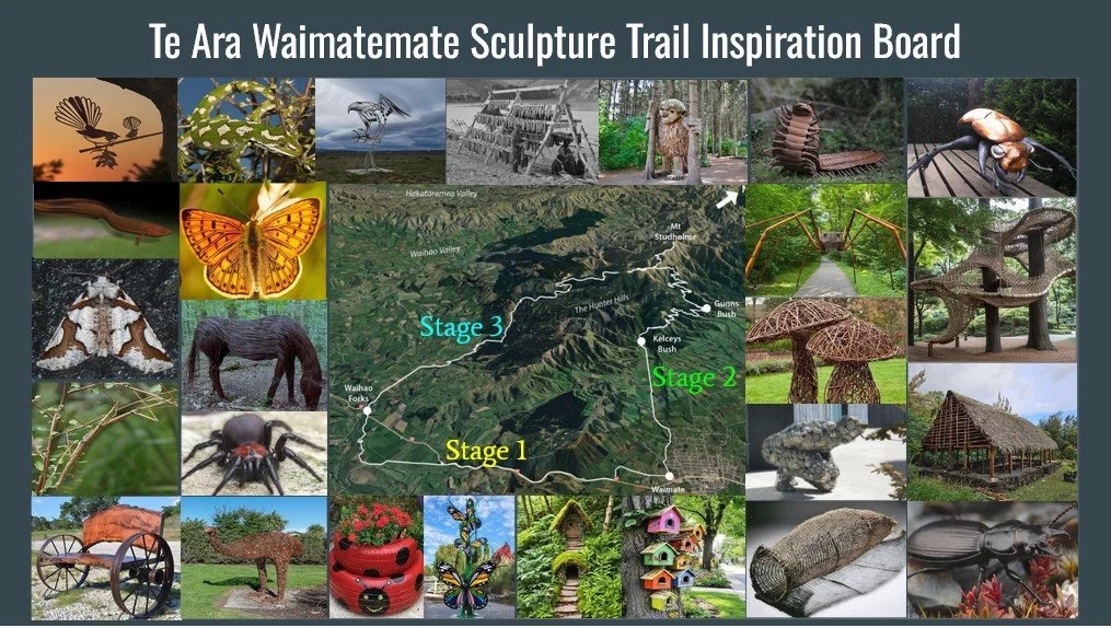 Our vision is an art trail that will supercharge Te Ara Waimatemate The Waimate Trail with large scale sculptures and artworks linking nature, people and place.